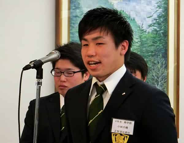 塚本英敏OB会副会長の乾杯で開式し、スタッフあいさつの後、ラグビー部より赤間OB会長、池本部長、長年菅平合宿でお世話になっている菅平国際ホテルベルニナの松本様に感謝状が贈られました。続いて4年生に、村田監督より記念品が贈呈され、各々から4年間の思い出や監督・スタッフ・後輩・OBの方々への感謝の言葉、そして後輩たちへ大学選手権出場をめざし頑張ってほしい等とのメッセージをいただきました。
