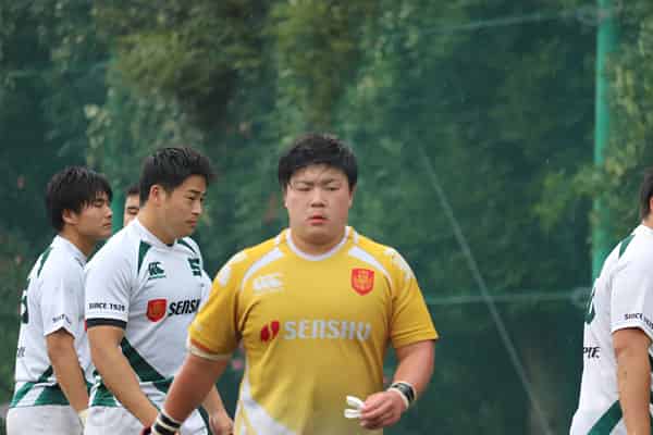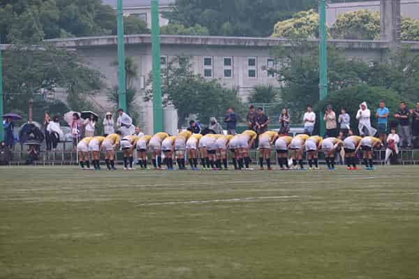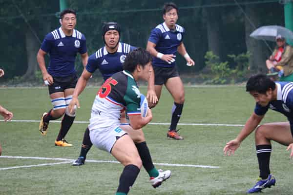 12時45分からBチームの試合が行われました。前半開始早々、1年WTB堀田がトライを決めると、続けて同じく1年HO米沢もトライを決めます。良い流れのまま中盤、細かいパスをつなぎWTB花田がトライし21-0に。その後2本連続でトライを奪われますが、粘り強くタックルしLO小川、途中出場したHO小栗がそれぞれトライを決め33-19で前半を折り返します。後半、序盤は動きがみられないまま試合は中盤に。中盤東海大学にトライを決められ33-26に。雨脚も強まり両者ともにミスが多くみられるようになり33-26のままノーサイド、勝利致しました。