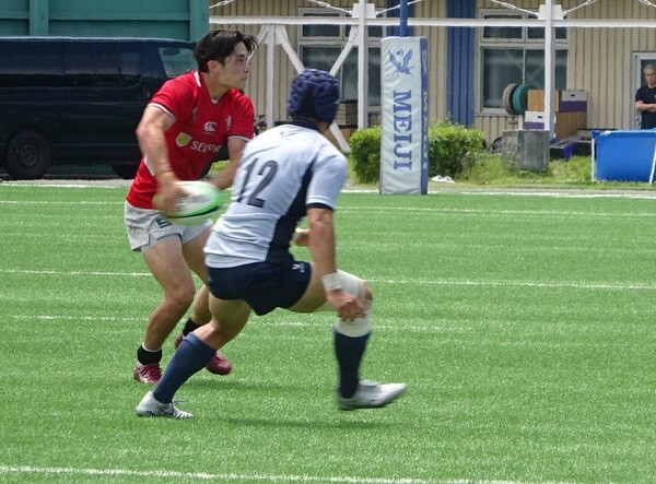 試合は12:00から開始されました。前半の序盤はミスが多くディフェンスの時間が多く16分までに3トライを許します。21分に敵陣でのラインアウトからモールを押し込み、さらにフォワードがサイドアタックを仕掛け、ディフェンスが薄くなったところをSH竹森がトライし7-19とします。24分にトライを返された後、30分に敵陣ゴール前でのラインアウトからフォワードが攻め込み最後はPR木原主将がトライし14-26と差を縮めます。36分にトライを追加され14-33で前半を終了します。