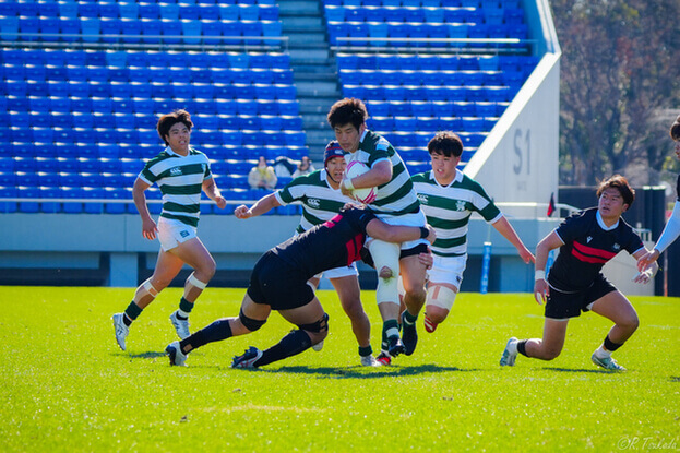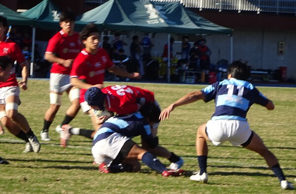 その後は一進一退の攻防が続きます。アタックでは、なかなかトライをとれない展開となりますが、ディフェンスでも随所に良いプレーが見える展開となります。危ないシーンでもLO高橋が必死に戻り相手のチャンスをつぶします。
