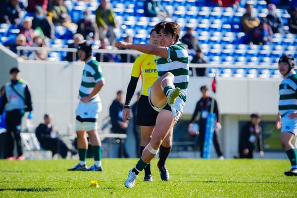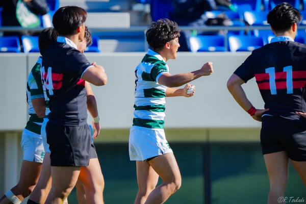 その後は両チームともに得点ができない時間が続きますが、前半34分敵陣深くまで攻め込みフォワードの連続アタックから一瞬のスキを突き、FB永井からWTB佐藤(瑛)と繋ぎトライを決め、相手を突き放します。