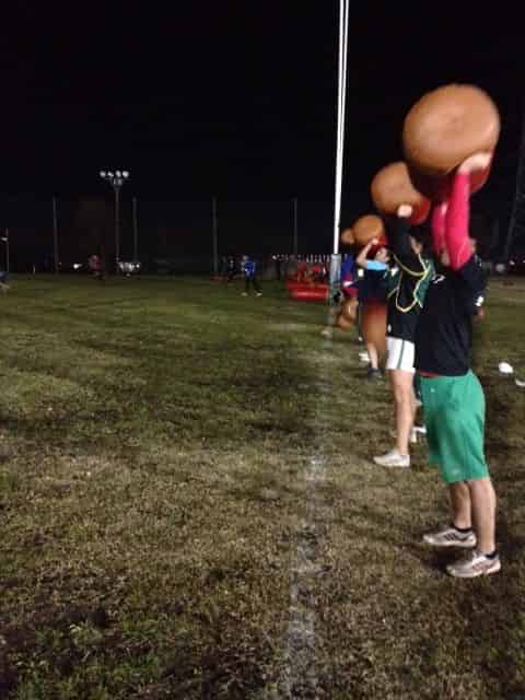 重いタックルバッグを使ったトレーニングやポリタンクを持って