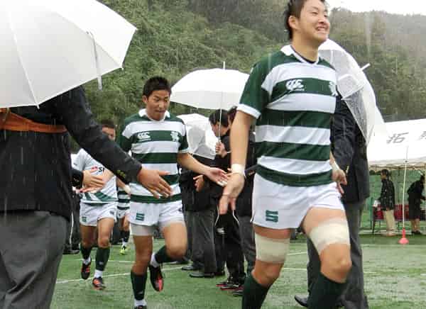 前半は、雨のためボールがすべり、ハンドリングミスが目立ち、また相手の好ディフェンスもあり思うような点数をとることができず、前半は12-5で折り返しました。