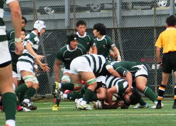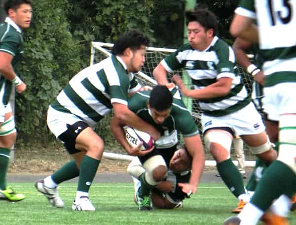 前半は、緊張からかタックル等のミスが目立ち、相手に2トライ(1ゴール)1ペナルティーゴールを許す苦しい展開となりました。20分過ぎから反撃を開始し1トライ1ゴールを返し、さらに前半の終わりにも相手ゴール前に迫りましたが、追加点を挙げられず前半は7-15で終了。