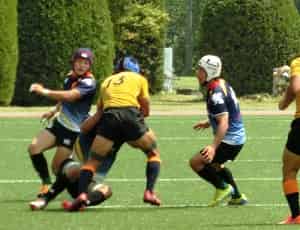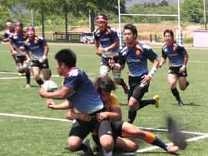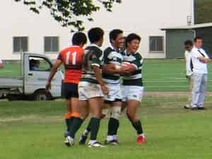 前半は先制トライを許しフォワードがプレッシャーをかけられ苦しい展開。その後1トライ1PGを返すものの3トライを追加され前半は10-24で終了。後半に入り、開始早々トライをあげ反撃開始。その後一進一退の展開でしたが、リザーブメンバーが入ったところで良いリズムが生まれ、28分に同点に追いつき、34分にはセンター太田のトライで逆転!終了間際の相手の攻撃を何とか食い止め31-24で勝利しました。
