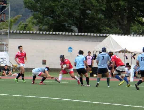 前半、相手に連続トライを奪われる苦しい展開。24分にスタンドオフ郡司のトライで反撃開始。1トライ追加されmすが、センター澤田、ウイング前田のトライで逆転し21-19。このまま折り返したかったところですが、前半終了間際にトライされ21ー26で前半終了。後半も入りが悪く2トライを奪われ突き放されます。しかし後半から出場したウイング砂子・関原のトライで31-40とせまります。1トライ追加されたあとも途中出場のプロップ石田の独走トライで追撃しますが、38-52で敗れました。