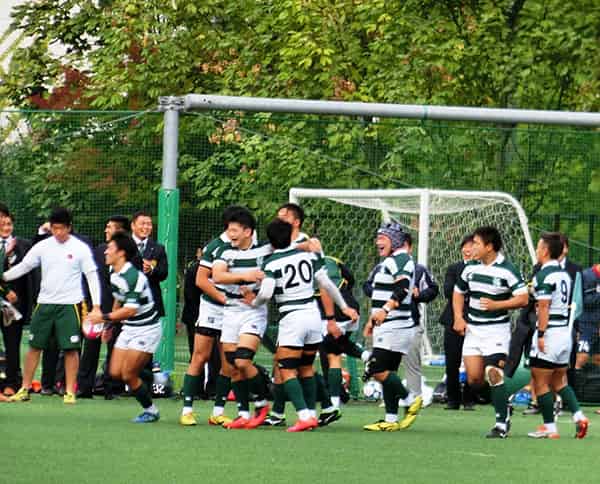 後半は、エリアをなかなかとれず自陣での時間が増えていきます。9分にこの日3本目のPGで21-16の5点差に。13分にCTB水野が相手ラインを切り裂きそのままトライ!(28-16)。18分にPG、22分にトライを奪われ28-26の2点になります。27分には相手ゴール前ラインアウトからモールを押し込みLO西村がトライ!33-26と再び突き放します。しかし32分に自陣ゴール前でモールからトライを奪われ33-33の同点に追いつかれます。35分には、相手のペナルティからPGを選択。静まった会場の中、FB田辺が見事にPGを成功(36-33)!。そして40分にゴール前スクラムから途中出場のSH中島、FB田辺とつなぎWTB池田がダメ押しのトライをあげ、41-33でノーサイドとなりました。