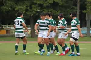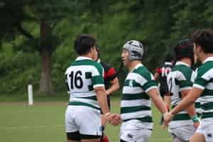 前半開始4分、LO田邊がトライし先制します。その後成蹊大学もトライを決め一時逆転されますが、中盤、FL坂本・HO宮本のFW陣が力で押し込みそれぞれトライを決めます。さらに敵陣に攻め込み続け、バックスの速いパスワークで大外に展開しCTB夏井がトライ、続いてスクラムよりパスをつなぎWTB水野(景)がトライし点差を広げます。前半40分にはFB松浦がペナルティゴールを決め、36-14で前半を折り返します。