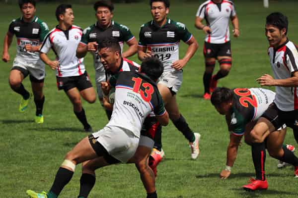 前半、先制点を奪いリードしますが、終盤相手チームのトライを許し接戦に。19-17と一歩リードした形で前半を折り返します。後半、開始早々相手チームに連続でトライを奪われ逆転されます。しかしその後のトライで試合は専修大学の流れに。そのまま自分たちのプレーをすることができ、64-38で勝利致しました。