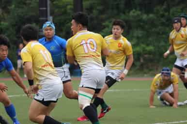 前半、開始早々パスを貰ったWTB千葉が50mを走り抜けトライをし先制点を奪います。続いて外にパスを繋ぎ、最後はWTB寺下がトライを決めます。その後1トライ奪われますが、WTB千葉が相手をハンドオフではじき、そのまま走り切りトライし反撃。中盤にはゴール前ラックからNo8熊谷がトライを決めます。その後、相手のペナルティから大きく敵陣に攻め込み、FL野口がトライ。終盤にはキックオフでボールを取った後、素早く攻撃、最後はFB片岡がトライし38-7で前半を折り返します。後半、開始早々BK陣で大外に展開し、その後HO米沢がトライ!その後1トライ返されますが、相手のキックをキャッチしたWTB千葉がハーフウェイより相手ディフェンスを突破し50mを走りき抜き、この試合3度目のトライを決めます。終盤にはラックからSH安藤がボールを持ち出し、パスを受けたWTB𠮷田(賢)が走り切りトライ。ラストは自陣10m付近よりボールを拾ったWTB𠮷田(賢)が敵陣まで大きくゲインし、その後CTB𠮷尾(泰)がトライしノーサイド。66-14で勝利致しました。
