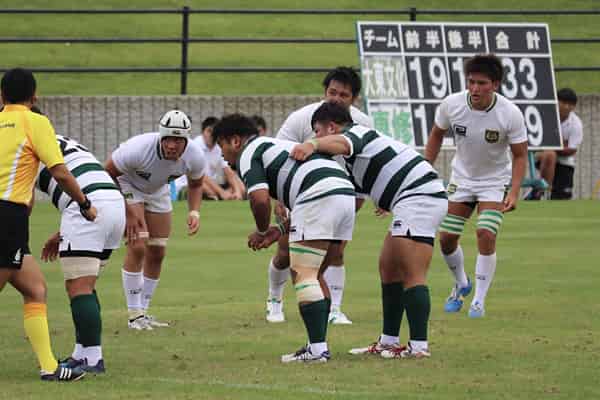 前半開始早々、大東文化大学に先制点を奪われます。その後も2トライを奪われ19-0と点差を広げられます。しかし中盤、敵陣ゴール前ラインアウトモールより、素早くパスを回しCTB平山がトライ!終盤にはゴール前のラックから外に回しWTB夏井(勇)がトライを決め12-19で前半を折り返します。後半、敵陣まで攻めこみますがミスでのターンオーバーが続き、大東文化大学に2トライを奪われ33-12と再度点差を広げられます。中盤WTB水野(景)が大きくゲイン、その後BK陣で大外に展開し最後はWTB夏井(勇)がこの試合2度目のトライを決めます。続いて、ラックから出たボールを貰った途中出場のFB片岡が、自ら仕掛け中央にトライし26-33となります。1トライ差で同点となる残り時間、最後まで攻めに行きますが取り切れず、26-33でノーサイド。惜敗致しました。