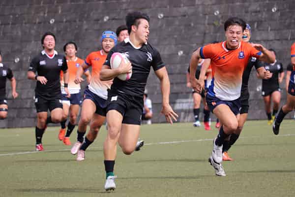 前半開始早々、法政大学にトライを決められ先制点を奪われます。その後両チームどちらも譲らず拮抗した戦いに。しかし前半24分、法政大学がゴール前で粘り、トライを決め追加点を奪います。その後、フェイズを重ね敵陣に攻め込み、粘り強くアタックし、最後はCTB松尾(東)がトライ。続いてFB松浦が敵陣10mからペナルティゴールを成功させ10-14と点差を縮めます。その後1トライ奪われますが、終盤、マイボールスクラムから出たボールをSO森野からWTB花田に繋ぎ、そのままハンドオフで相手をかわし40mを走り切りトライ!17-21と僅差で前半を折り返します。