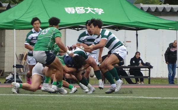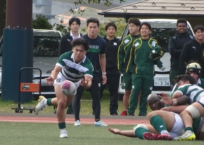 後半に入り、6分にトライを許しますが、11分に外へ連続攻撃で仕掛けFB新野がトライ、19分にも同様な展開からCTB中森がトライして35-14とリードを広げます。26分には相手ゴール前まで迫りラックからPR木原主将が右隅に持ち込みダメ押しのトライを決めます。32分にはFWBK一体となったアタックからHO山内がトライ、36分にはFWの縦攻撃の後、BKに展開してCTB中森がこの日2つ目のトライをします。終了間際にトライされたものの52-24で勝利しました。